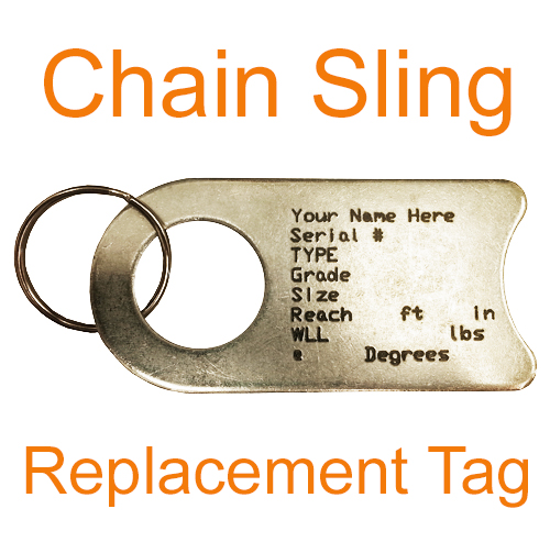 Additionally, we do offer custom engraving on tags for $19.99/each (bulk discounts apply as well). We also offer two sizes of rings if you will be attaching the tag to larger chain. This is common on single legged chain slings where the tag cannot be used on a coupler.