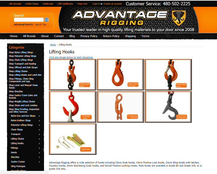 We've also made some serious changes to the store design and layout that you might not notice right away, but that should make it easier for you to navigate. On the side-navigation bar, under categories, we now have a wider selection of "Shop by" categories that link to graphic merchandise layout. Easy to identify pictures help point you to the category you want to shop. For example, this is our new graphic navigation menu for Lifting Hooks.